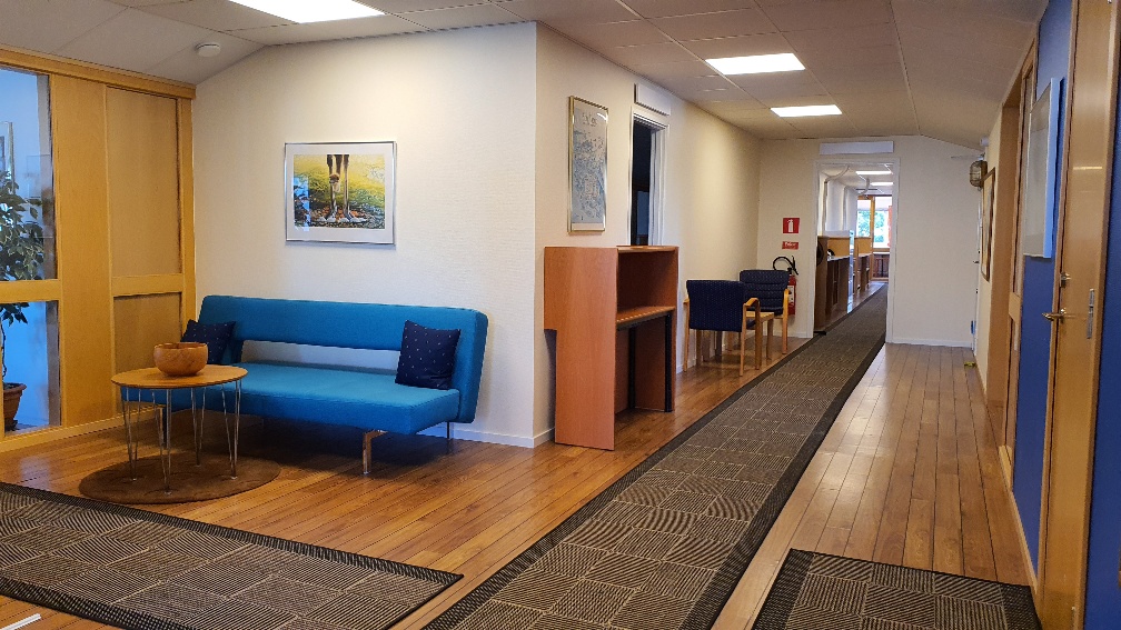 Gemensam entré och reception med ingång till toaltter, kapprum, kök och konferensrum.