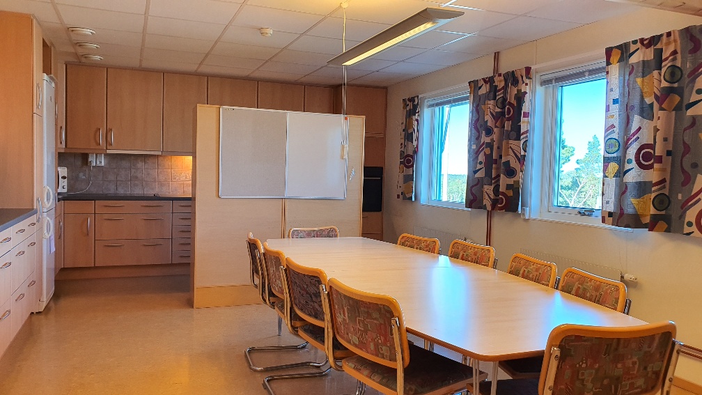 Kyl och frys, spishäll, flera mikrovågsugnar, varmluftsugn samt avställningsytor. Perfekt för fika och lunch.